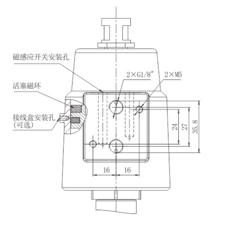 4.氣缸(gāng)活塞內嵌磁環,並(bìng)分別預留磁信號開和關安裝孔,可反饋閥門(mén)運行過程中開和關的狀態信號。
